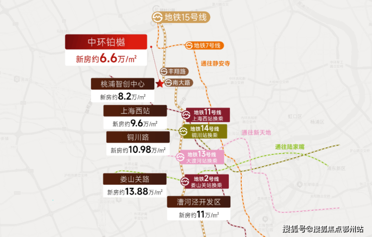 中环铂樾坐拥 15号线南大路站(直线约300米),真正实现“地铁到家”的便捷生活。从这里出发, 4 站畅达 上海西站 ( 新房均价 9 万 + /㎡ )、 5 站轻松抵达 铜川路 ( 新房均价 10 万 + /㎡ ) 、 9 站直达 娄山关路 ( 新房均价 13 万 + /㎡ ),轻松串联城市核心板块。此外, 15号线更可快速换乘 2/7 / 11/ 13 /14 号线,无缝衔接大宁、虹口、陆家嘴等繁华商圈,商务出行、休闲娱乐皆高效无忧。