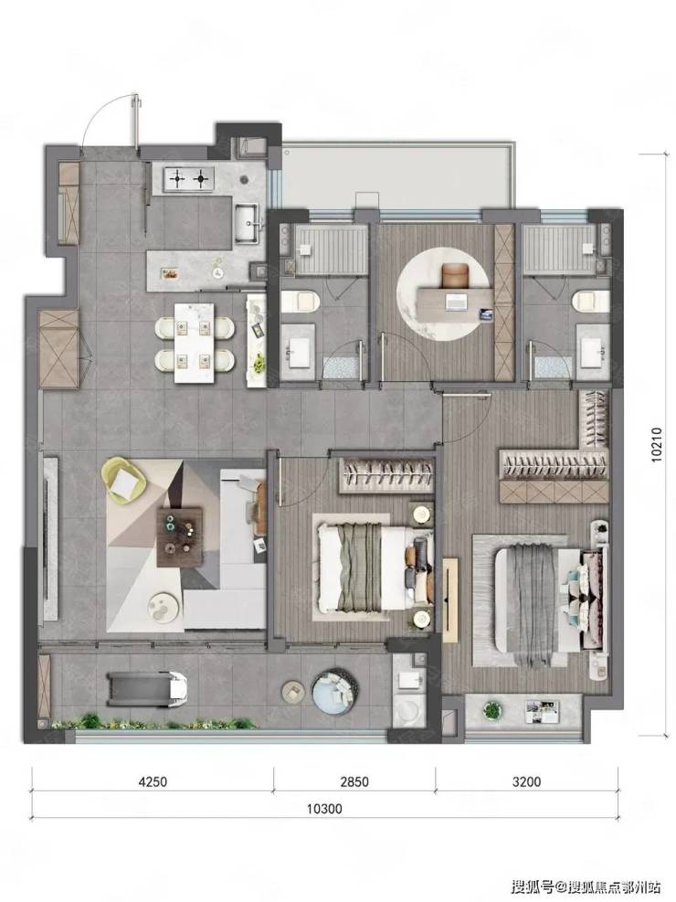 我们现在看到的是建筑面积约110平户型,这是一个三室两厅两卫的布局。