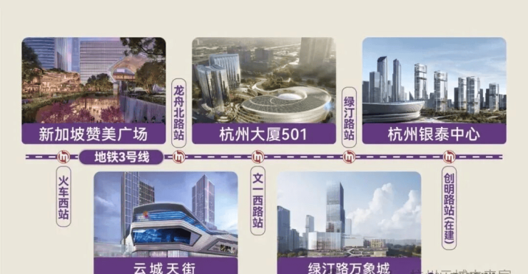 ✦杭州银泰中心(预计2026年一季度全面开工):3号线创明路站(在建),全国第五座、杭州首座银泰中心,总投资近70亿元,总体量约60万方,规划融合顶级购物中心、超甲级写字楼与高端酒店,致力于建成 “辐射长三角的超区域型城市综合体”。(数据来源:杭州市余杭区人民政府)