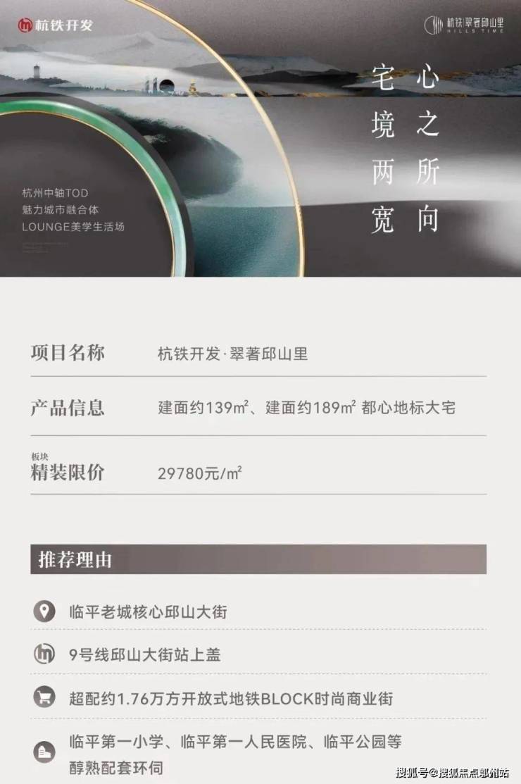 精装限价为29780元/㎡。该楼盘择址9号线邱山大街站,靠近临平老城醇熟资源和临平山稀贵自然资源。与杭州钱江新城一期/二期丰盛配套无缝接驳,凭借杭铁国企匠心品质,开启临平高阶生活。项目自带约1.76万方商业为基底,地铁直通住宅地下室。周边配套齐全,生活配套便利,医疗设施完善,教育资源成熟,交通便捷。无论是自住人群还是改善人群,都能在这里找到理想的居住环境。
