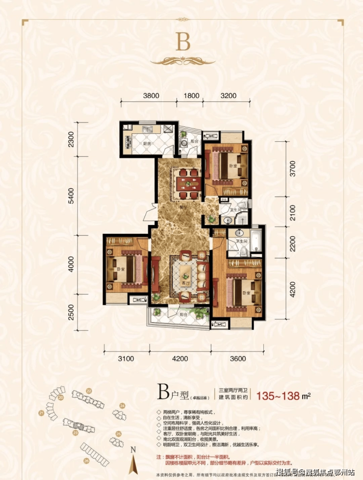 建面约135-138平B户型 三室两厅两卫