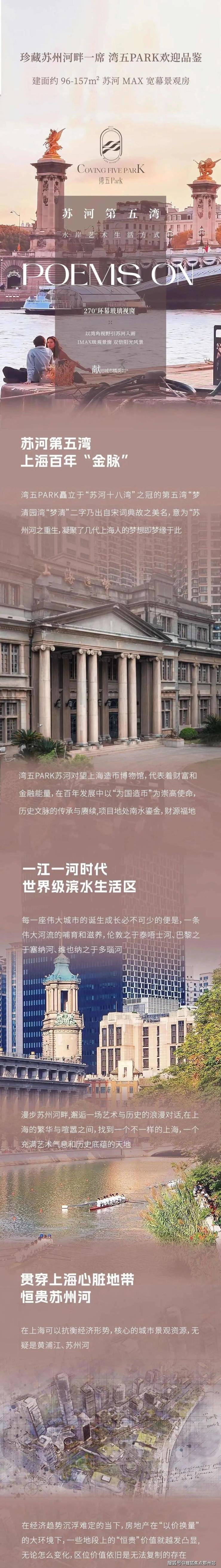 苏河第五湾 春雨渐河畔 苏州河畔精装公寓、苏河湾、长风等高端住区也在发展中崛起,苏河湾更是已成一线顶流,标杆次新华侨城苏河湾二手均价能卖到20万/㎡+;近年来招商苏河玺、越秀·苏河·和樾府等盘入市,更是迅速清盘。我们从沿岸板块天梯图排名也可感受到, 自西向东流向的苏州河沿岸板块,也正与环线逻辑相契合,越往内地段越好。 这一点,与黄浦江沿岸截然相反,后者更多异军突起的新兴板块,如前滩、徐汇滨江与东外滩等。