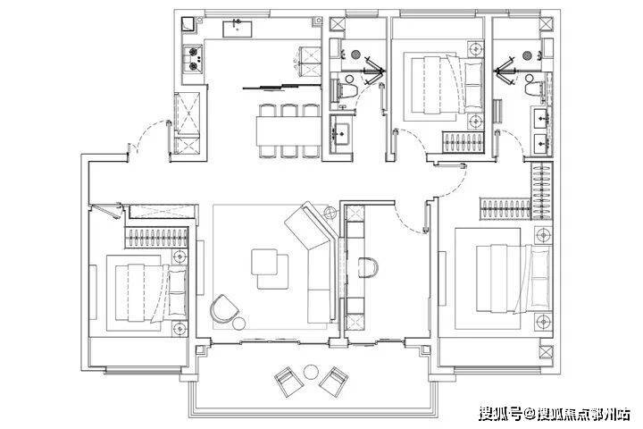 厨房连接北阳台,豪华主卧套房设计。