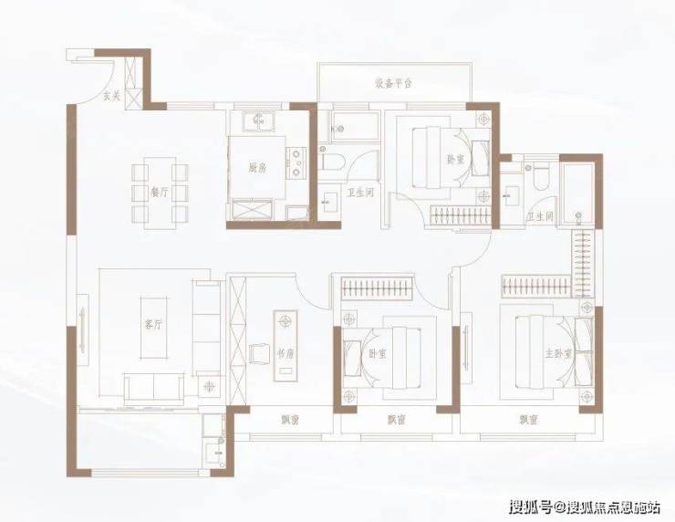 138㎡户型开间阔绰,4室2厅2卫,三房朝南,均赠送飘窗。