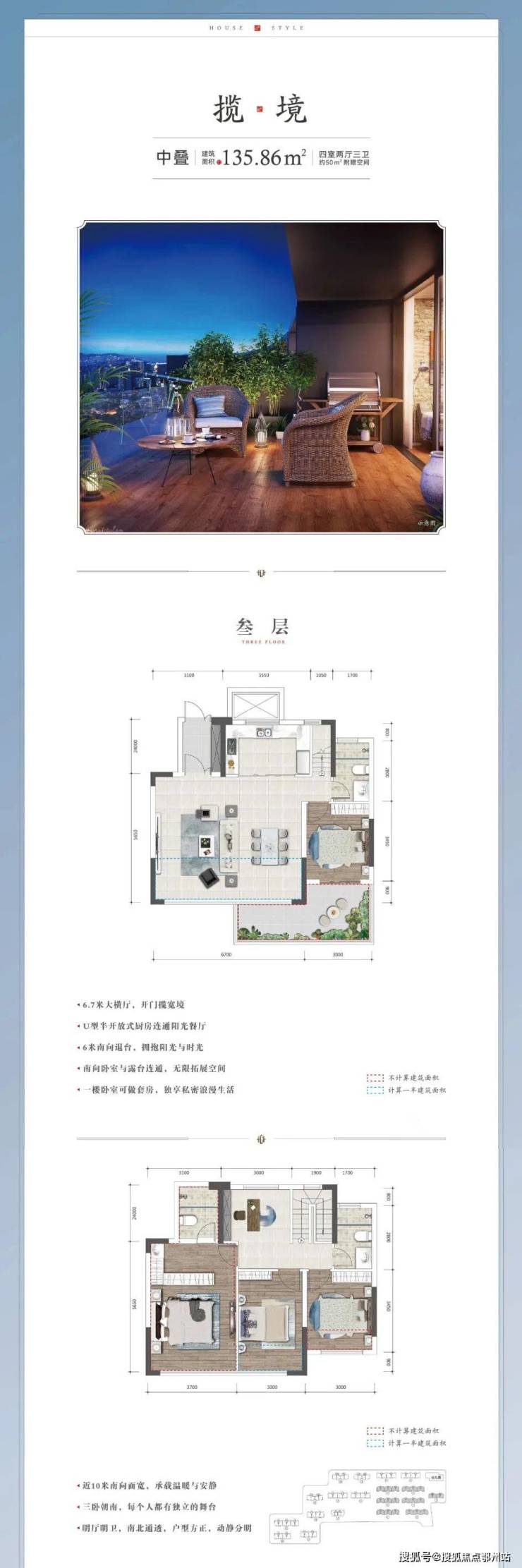 叠墅:总高6F,分上叠、中叠、下叠,一梯两户,建面约135-142㎡
