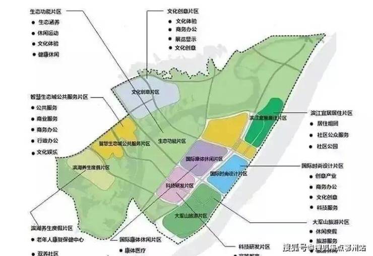 智慧生态城规划有生态功能片区、文化创意片区、滨江宜居居住片区、智慧生态城公共服务片区、国际时尚设计片区、大军山旅游片区、科技研发片区、国际康体休闲片区、滨湖养生度假片区等。