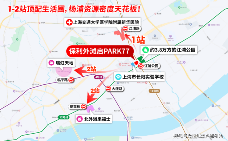 更难得的是, 1-2站范围内,三甲新华医院、北外滩来福士、瑞虹商圈、江浦公园、长阳实验学校等顶配资源一应俱全。