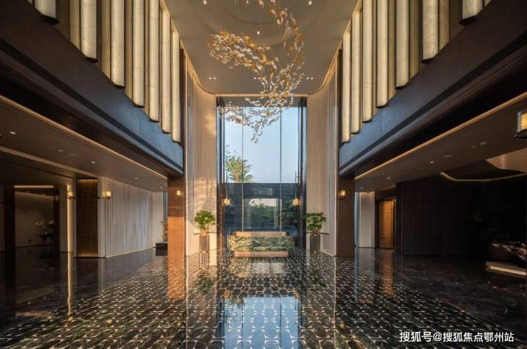 水刀拼花大理石地面、艺术吊灯、同样约9米的挑高配上大面的水景,一路走来,仪式感十足。