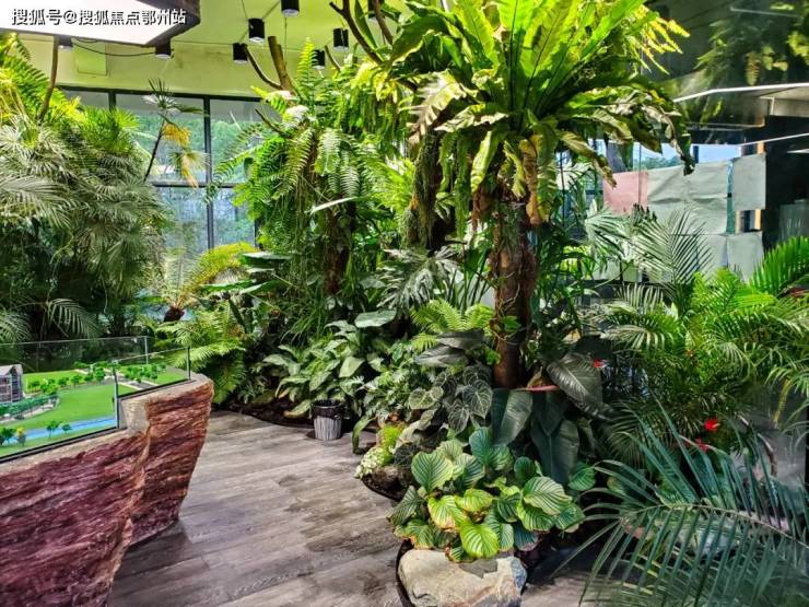 该度假酒店以热带雨林为主题,因运营所需,需要为酒店设计一个临时接待处。营造绿植环抱的氛围,以强化其热带雨林主题的体验感。经过论证,选择项目建设地边的一个已建成临时建筑,将其改造为接待处。室内空间的设计重点放在沙盘展示区,以绿植围绕沙盘。局部设置镜面,以反射植物形象,在视觉体验上增强空间感,实现“满眼绿”。