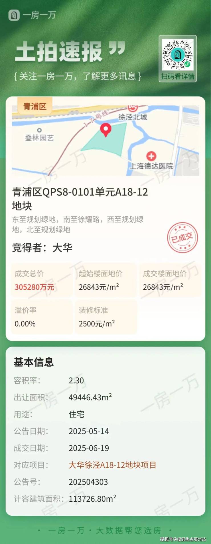 该项目为2025年上海第五批次土拍中,大华集团以30.5亿元底价竞得的纯住宅用地,楼板价26843元/㎡。