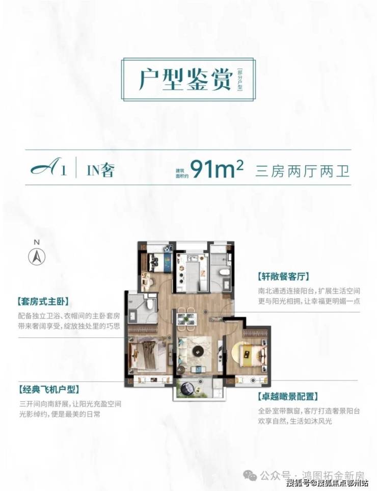洋房(建面约74-91㎡):全明飞机户型,91㎡三房两卫设计,精装交付配新风/地暖/中央空调,得房率超80%。