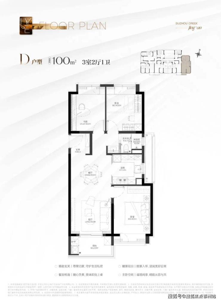建筑面积约100㎡3房D户型:南北通透的设计让该户型拥有更加优秀的通风效果。而且这个户型做到了全卧飘窗(3个飘窗)+南向瞰景大阳台,丰富的灵动空间提升了实得面积!