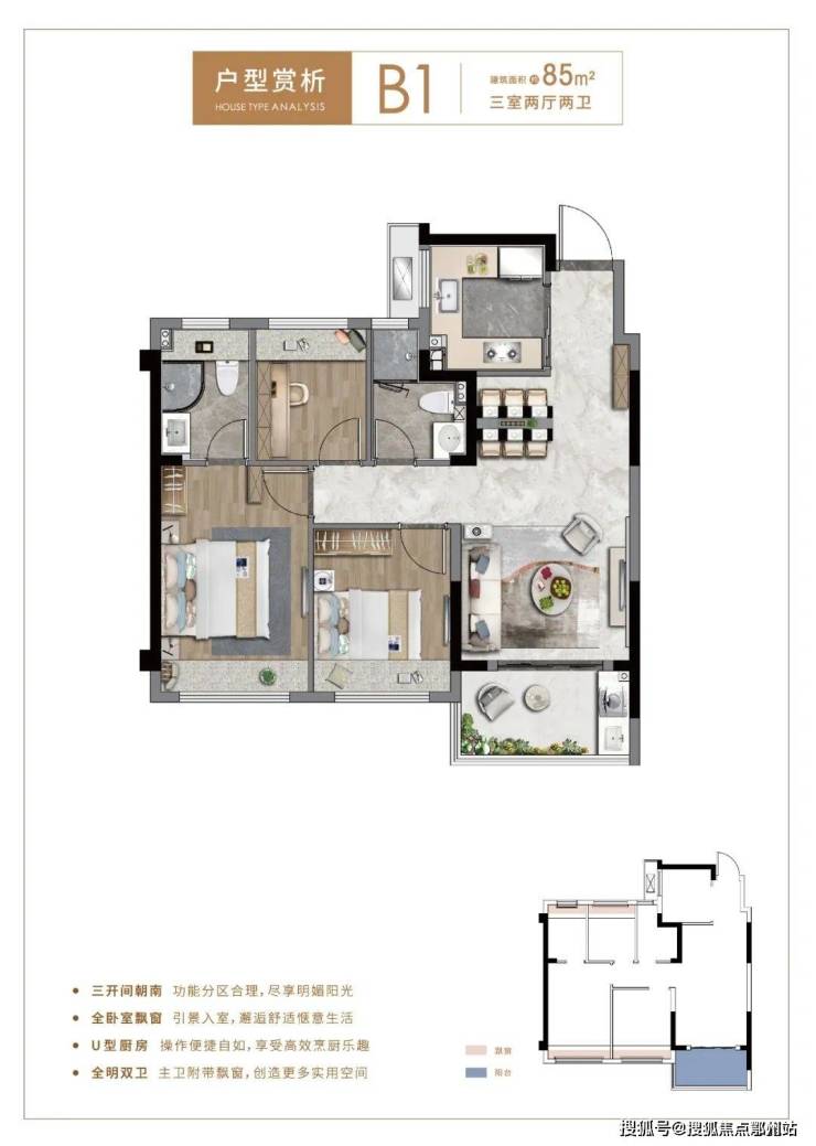 市面上绝大部分80+㎡户型做到三房已是极致,但 项目建面约85㎡户型不仅实现3房功能性一步到位,甚至做到了2卫,舒适度和私密性更上一层楼!