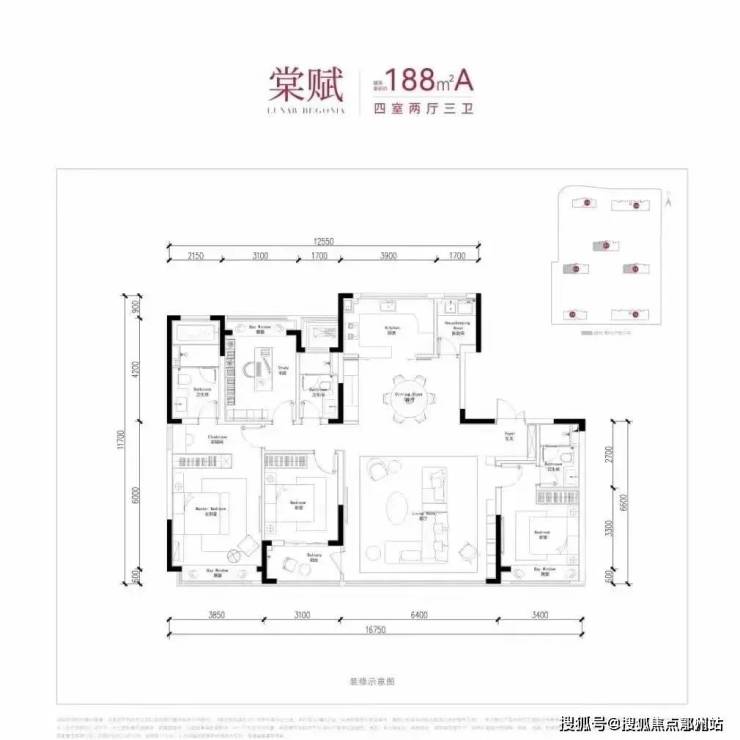 建面约188㎡的四房三卫,是最大的一个户型,有约6.4米的大横厅、约7.3米的瞰景阳台,空间感最足。