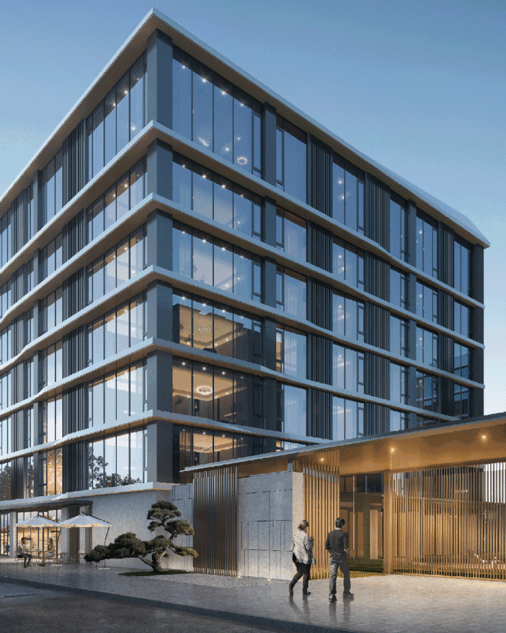 采用歇山、硬山和小披檐等手法,丰富建筑造型与建筑空间感受。外立面以浅色石材为主材料,屋面采用深色日式合瓦的形式,搭配深色金属构件,勾勒出粉墙黛瓦的中式意向,使得色彩构成冷暖有机结合,时尚精致、典雅简约。
