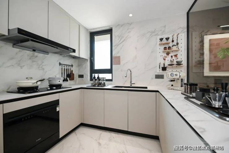 在厨房玻璃窗下面,樟湾国际人性化增设了 西厨岛台,操作台面增加48.18%,常用的咖啡机、空气炸锅可以放在台面上,有需要直接用,而不常用的小电器和碗碟就可以放在岛台下面的柜子里收纳,满足年轻人的精致实用主义。
