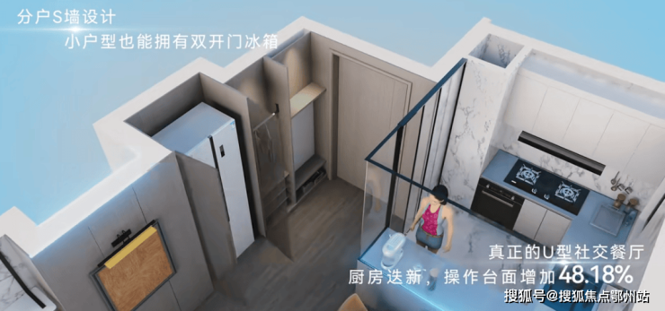 对于小户型来说,大冰箱放哪里一直是难中之难,放厨房太挤,放客厅可能拿取不方便,在这个户型里,樟湾国际在玄关柜旁内嵌了S墙,提前预留了双开门冰箱位置,解放了厨房空间,又与厨房和餐厅形成合理的三角互动动线,让小户型也能完美拥有双开门冰箱。