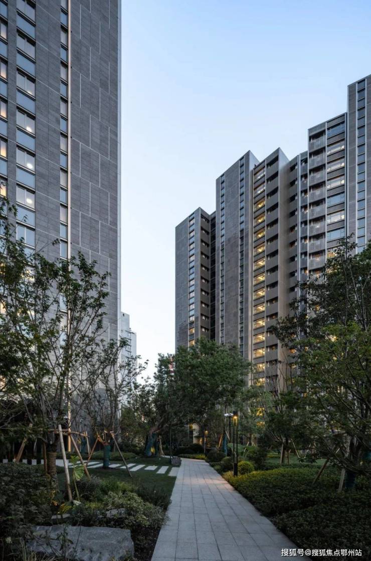 立面材料选取稍显沉稳的“皇室啡”花岗岩,其特殊的颜色与纹理,既能与北侧的办公统一色调风格,也能和周边现有的高容积率建筑,以及绿树成荫的街道环境融为一体,呈现低调精致、简洁大方的高品质住宅形象。