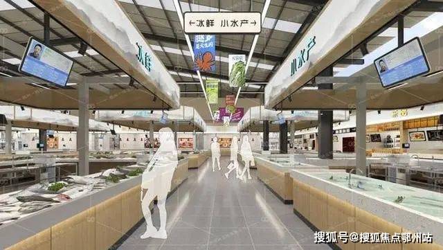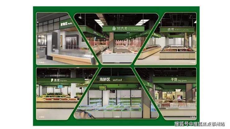 规划八大功能区域,涵盖生鲜食品全产业链——肉制品加工区、即食餐饮区、果蔬专区、鲜活水产区、粮油副食区、特色农产品展销区、日用品零售区及社区服务配套。