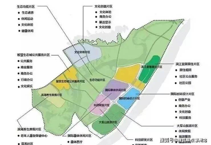 智慧生态城规划有生态功能片区、文化创意片区、滨江宜居居住片区、智慧生态城公共服务片区、国际时尚设计片区、大军山旅游片区、科技研发片区、国际康体休闲片区、滨湖养生度假片区等。
