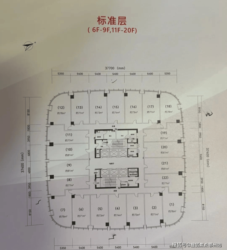 户型基本呈对称分布,西北面和东南面为71-74㎡,东北和西南为77-81㎡,挂角为78㎡户型。