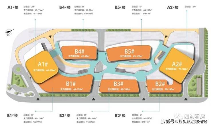 楼栋分布:由2栋塔楼和5栋盒子组成;两栋塔楼A1、A2分别为20层和29层,盒子B1、B2、B3、B4、B5均为5层,且1-2层为自持运营的商业。