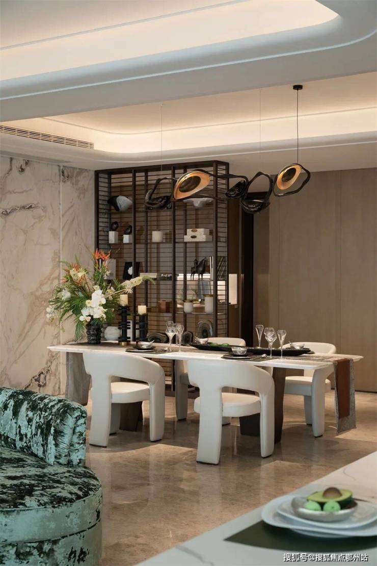 基于LDKB的布局,家人们共享整个空间,生活中的交互或社交时的沟通都可以轻松展开。餐厅背景奢石结合玄关金属隔断柜,一体化的形式下更添品质属性。空间上强化了交流与互动的核心,各个空间没有做刻意的分割,保持了空间的完整性和互动性。通过舒适宁静的空间节奏,带给使用者连贯的居家体系,保留“家”的韵味。