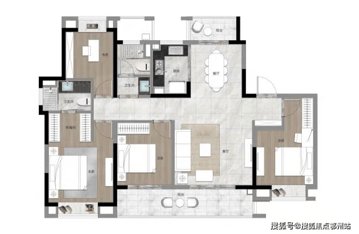建面约139㎡四开间朝南, 餐客厅一体、贯通式双阳台设计,采光、通透性能得到很好的保障,匹配改善人群所需。让人惊喜的是, 餐厅北侧还带一个生活阳台,非常优秀了。