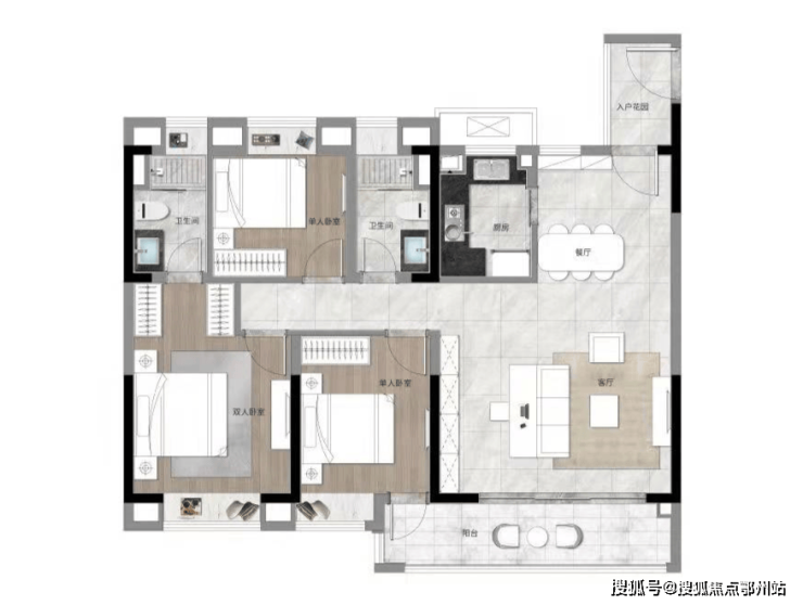 起步建面约100㎡,做到 三房两厅两卫设计。双阳台开间尺度达到了 约6.5米,还是 南北通透、U型厨房
