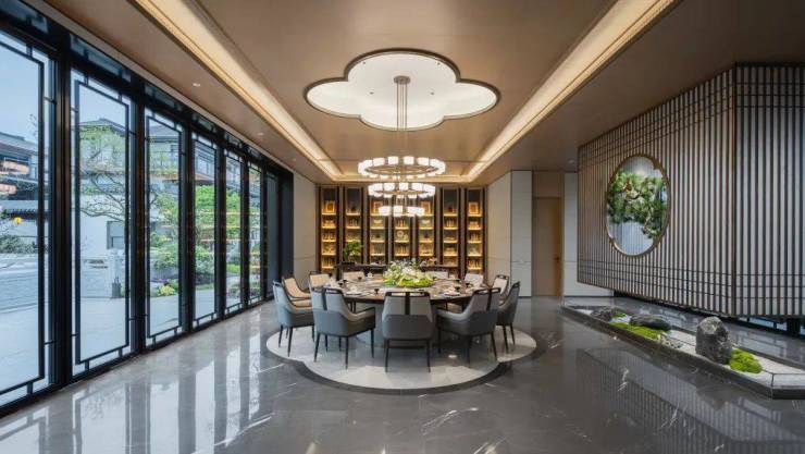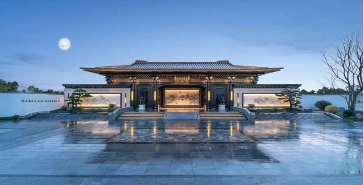 项目遵循「儒门、道园、唐风、华纹」的新中式匠造理念,以唐诗意境为魂,萃取拙政园的造园精髓,打造出约2000㎡中轴景观,演绎「一轴、八院、八坊」的皇家园林气势。