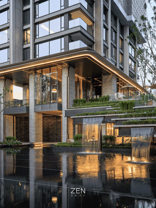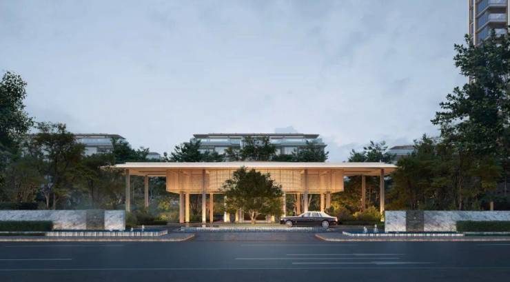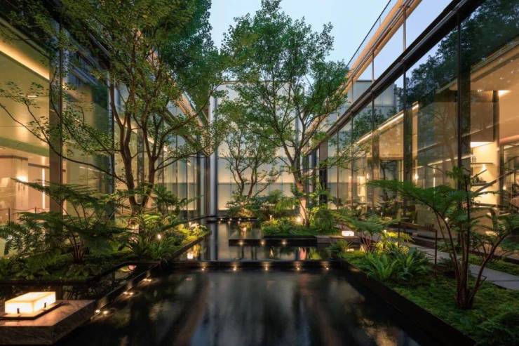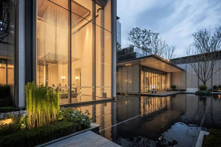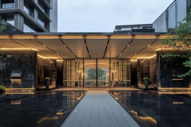 经过前场的漂浮花园,静谧隐奢的归家大堂映入眼帘,超尺度仿石铝板飞檐融于公园,静谧的深色石材景墙,营造迎候的仪式感,前后庭院渗透的超白玻玻璃幕墙围合的大堂,保证前园后庭的空间视觉渗透,形成公园里的隐奢之境,营造室外桃园之境;