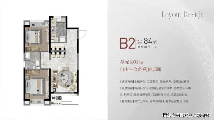 建面约84㎡2房2厅1卫,做到了双开间朝南+双卧室带飘窗+动静分离,非常宽敞的2房户型。