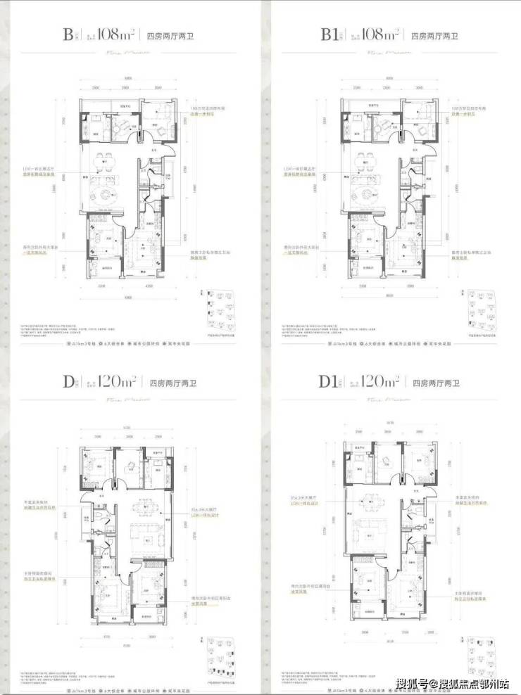 更大一些的户型如建面约 108㎡、120m²的四房边套 设计,不仅面积宽敞,南向双卧室+客厅大飘窗的设计也提升了居住舒适度。