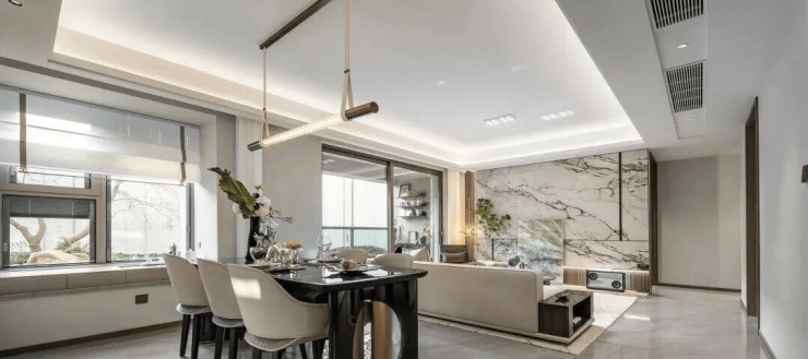 入户玄关设计, 设置了一个不小的隐蔽储物间,大大增加了室内的储藏空间,可以将平时不用的闲置物归纳于此。客餐厅阳台一体设计,客厅南连宽景阳台,餐厅南连飘窗,南北通透采光,将生活的奢度打开。