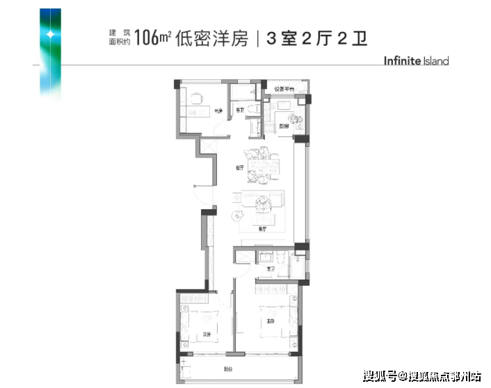 建面约106㎡的户型是市场上难得的小户型边套产品,南向双开间,同样的双联阳台打造,餐客厅一体化设计链接阔景飘窗,充分保证整个房间的采光面,后期居住舒适度更高。