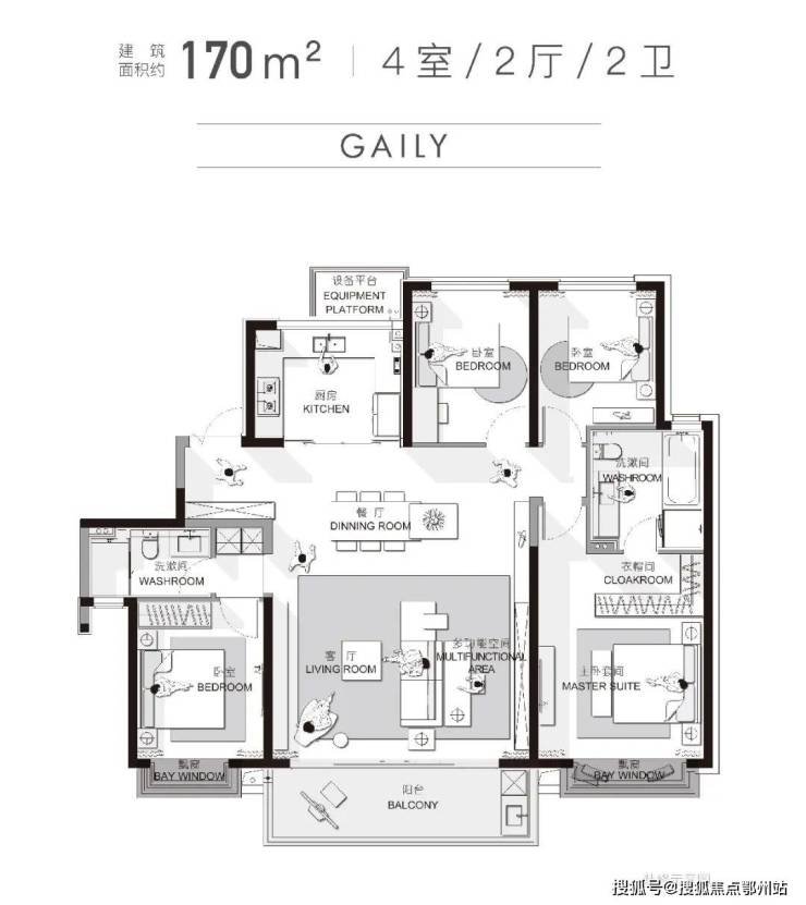 建面约170㎡四房两厅两卫: 做到了宽屏大开间、全明采光、多套房配置,改善的排面和尊崇感尽显,非常适合追求该品质改善、或三代同堂的买房人。