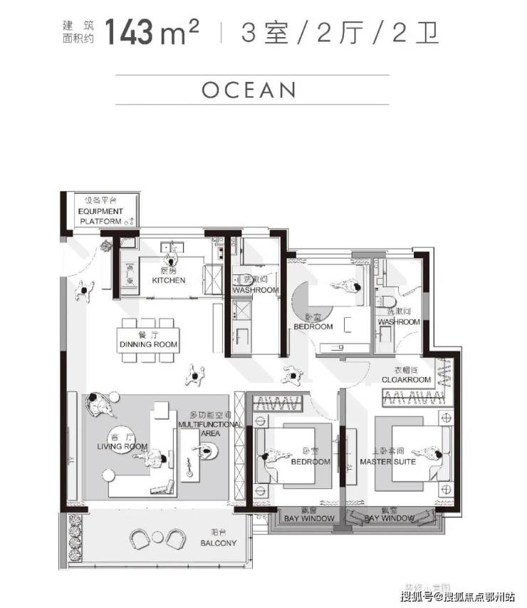建面约143㎡三房两厅两卫: 客餐一体化设计,打造出巨幕剧场式家庭大公区,空间感和奢适感拉满!