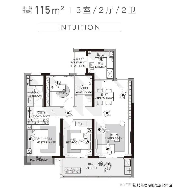 建面约115㎡三房两厅两卫: 入户花园+餐客厅一体化+三开间朝南+南向双阳台+观景飘窗+双卫,非常适合初改家庭。