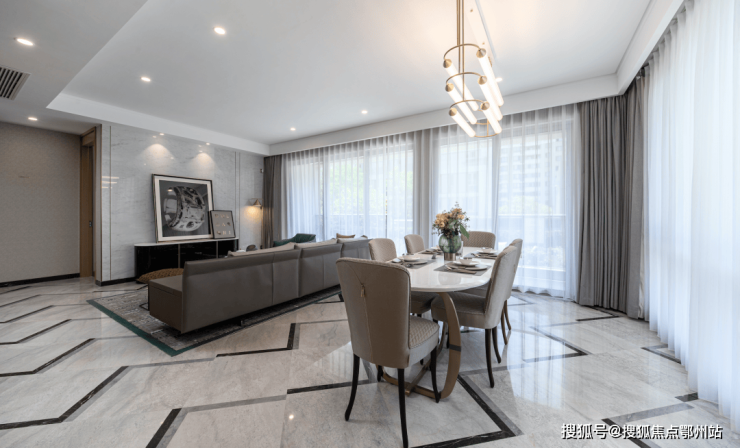 餐客厅竟通铺拼花大理石!都知道,大理石的成本或是瓷砖的数倍,这两年几乎只能在商业大平层里,才能看到如此阔绰的大手笔。