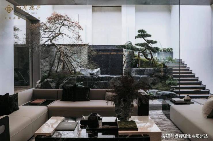在丰沛的功能区之上,西湖逸庐还特意增加了一处 下沉式庭院。绿植、叠石和流水巧妙组合,一座精巧的山水园林就此诞生。
