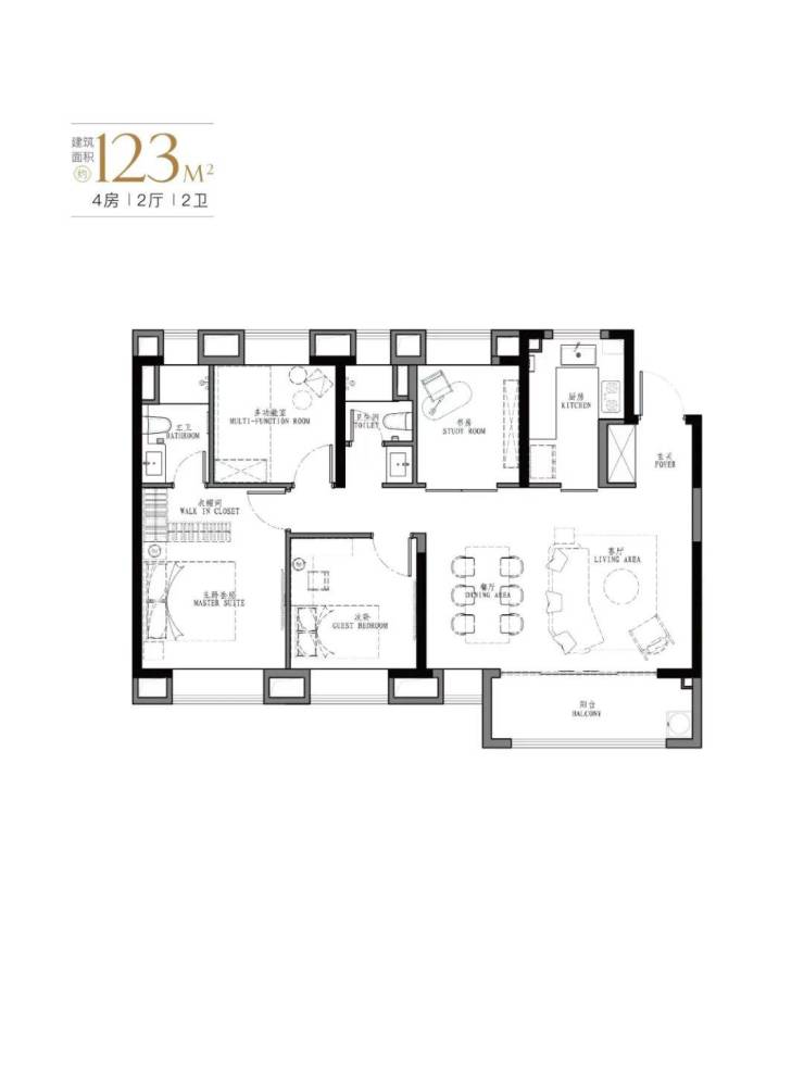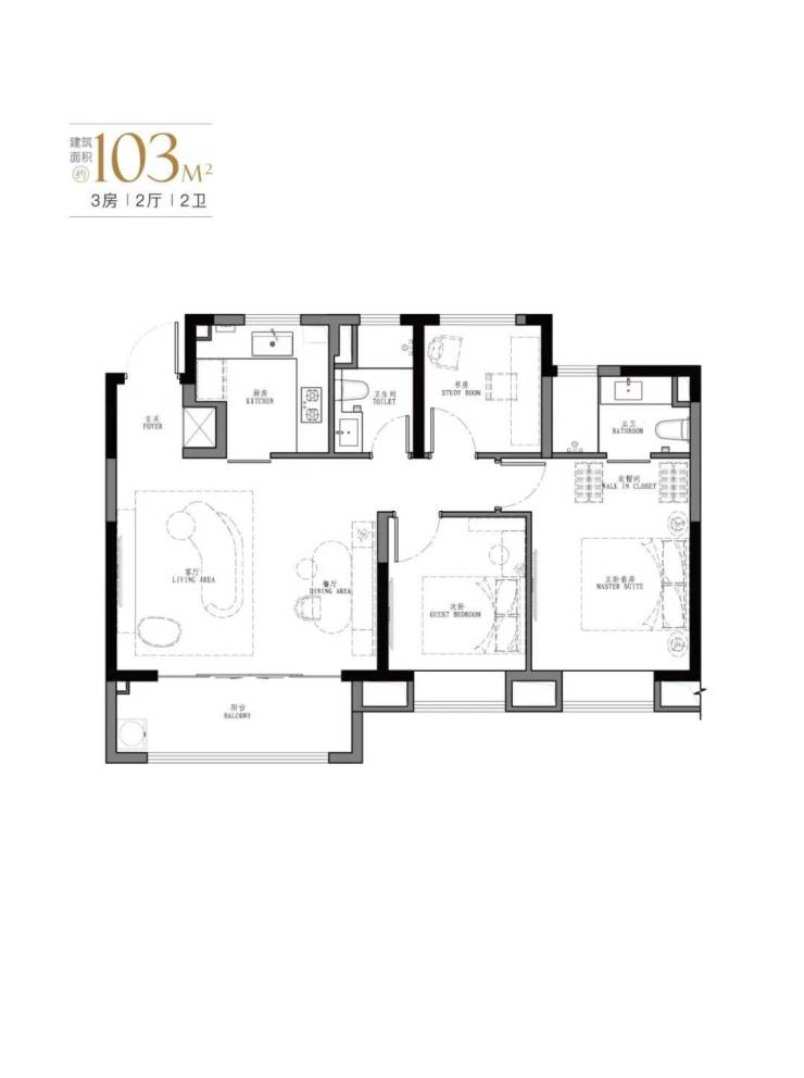 产品: 103㎡、107㎡的三房两厅两卫及123㎡、129㎡的四房两厅两卫。