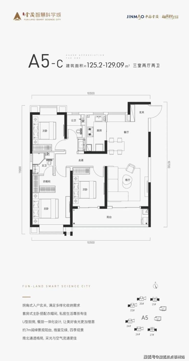 建面约125-129㎡的A5-c户型,3室2厅2卫:边户,三开间朝南;南北通透,户型方正,动静分区,主卧带独立卫生间,南向大阳台连通卧室。