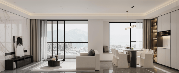 建筑立面采用流体瀑布式立面,实现建筑光影美学的黄金比例,呈现打破时间桎梏的高级品质感;大尺度窗墙比、顶层材质延用国际简约风格美学,在细节之处精于琢造,实现建筑整体别具一格的形象风格。