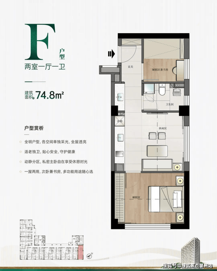 F户型为两室一厅一卫格局,其建筑面积约74.8㎡ 。