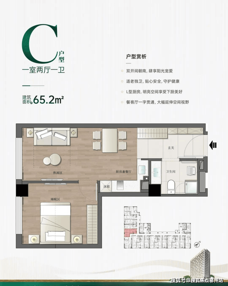 C户型为一室两厅一卫的格局,其建筑面积大约为65.2㎡ 。