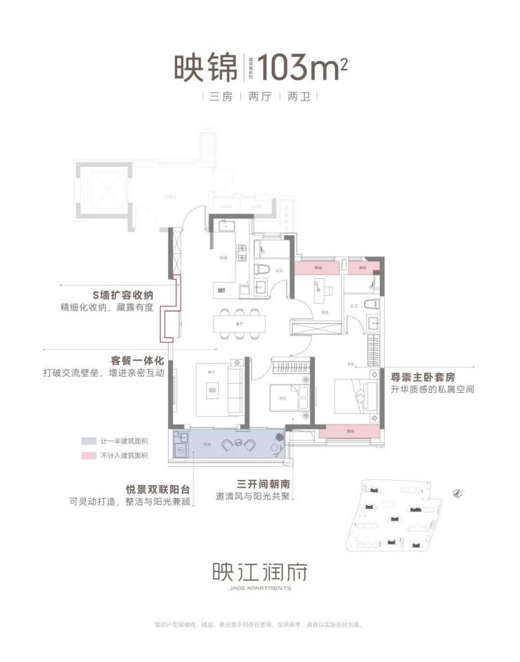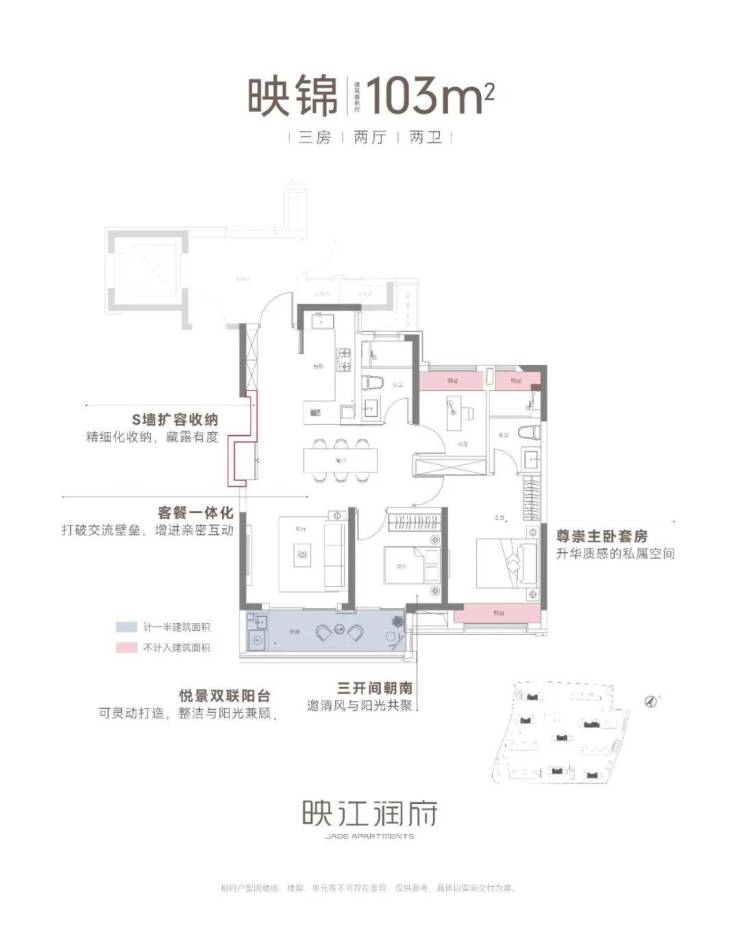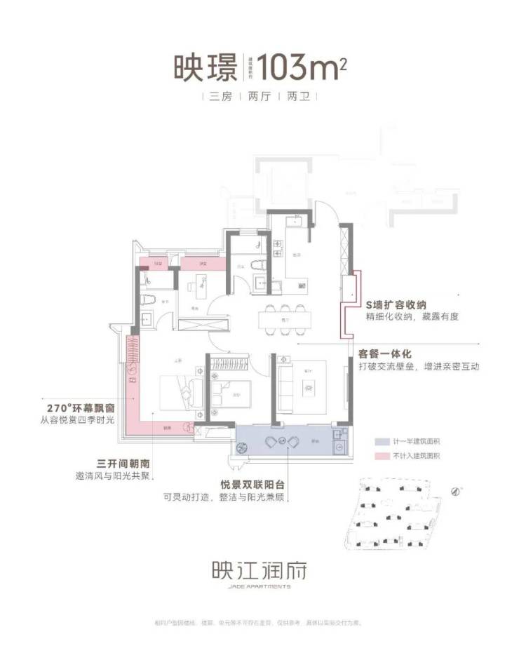 建筑面积约103㎡三房两厅两卫,不失为改善家庭的首选。其中边套户型,映江润府的主卧套房 做了 270°环幕飘窗, 实现无与伦比的采光通风和视野享受,类比于千万级豪宅的体验!