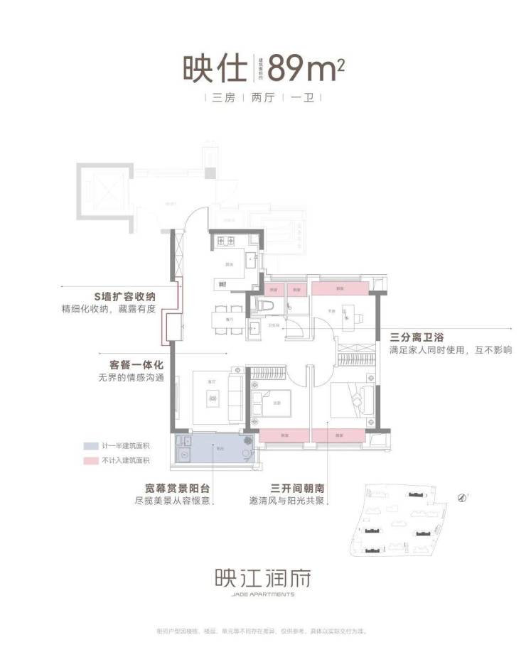 其次是 户型设计。 在户型产品同质化严重的当下,映江润府花更多心思在户型创新设计,给到置业者更美好的家的体验。建筑面积约89㎡王炸小豪宅户型,拥有四大高光细节和创新设计,在市面上同类产品中非常能打。
