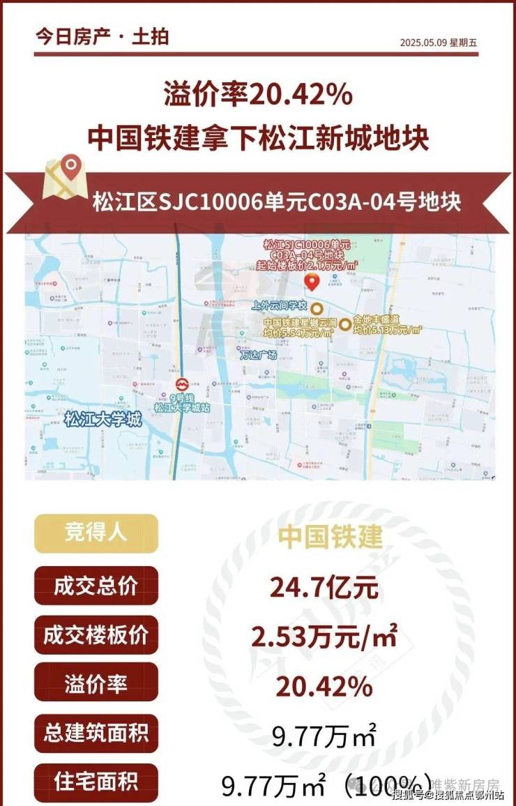 中铁建西派云间的诞生,源于2025年5月9日上海四批次土拍的焦点之战:中铁建以24.7亿元总价、20.42%溢价率拿下松江区SJC10006单元C03A-04号地块,折合楼板价25288元/㎡(装修标准不小于2500元/㎡)。
