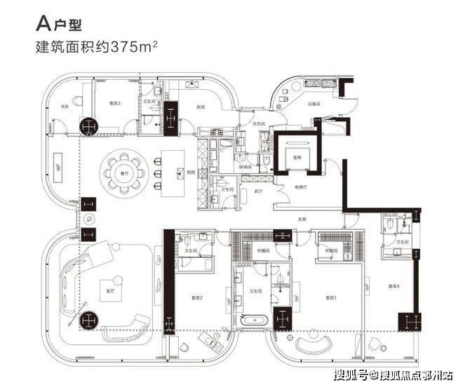 面积:375㎡,赠送约107㎡,得房率约93%,户型设计6房6卫,