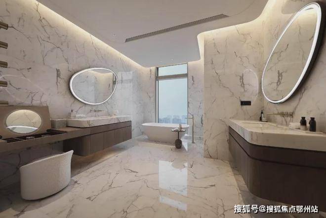 大尺度的高效利用,也让EIC大平层呈现出更多超越此前的空间享受。南向三个套房,24米的开间,停得下4辆加长林肯。进入主卧,罕见的主卫双开门设计,比一般人的主卧都要大,鱼肚白通顶,劳芬捷仕满配,甚至连公卫都是劳芬智能马桶,在这里泡澡,根本不用考虑窗帘。